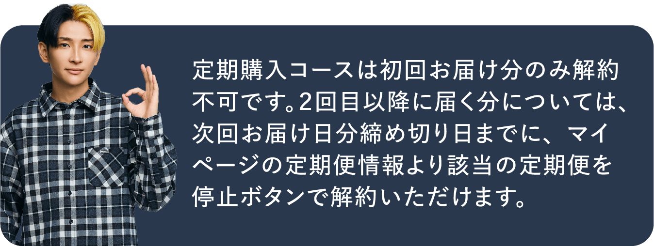 ※定期購入コースは初回お届け分のみ解約不可です。2回目以降に届く分については、次回お届け日分締め切り日までに、マイページの定期便情報より該当の定期便を停止ボタンで解約いただけます。