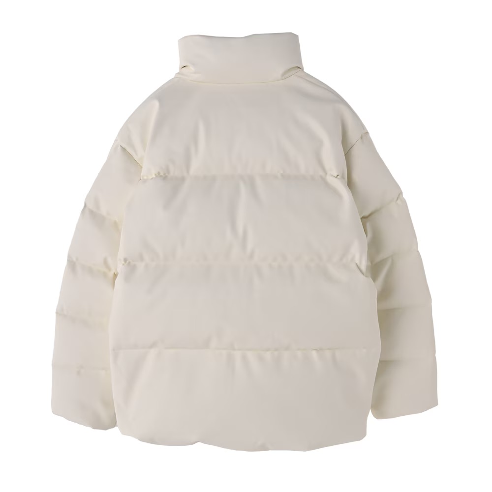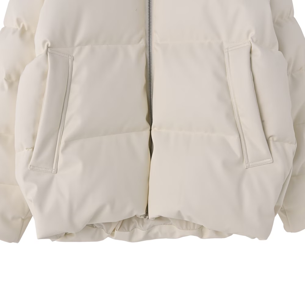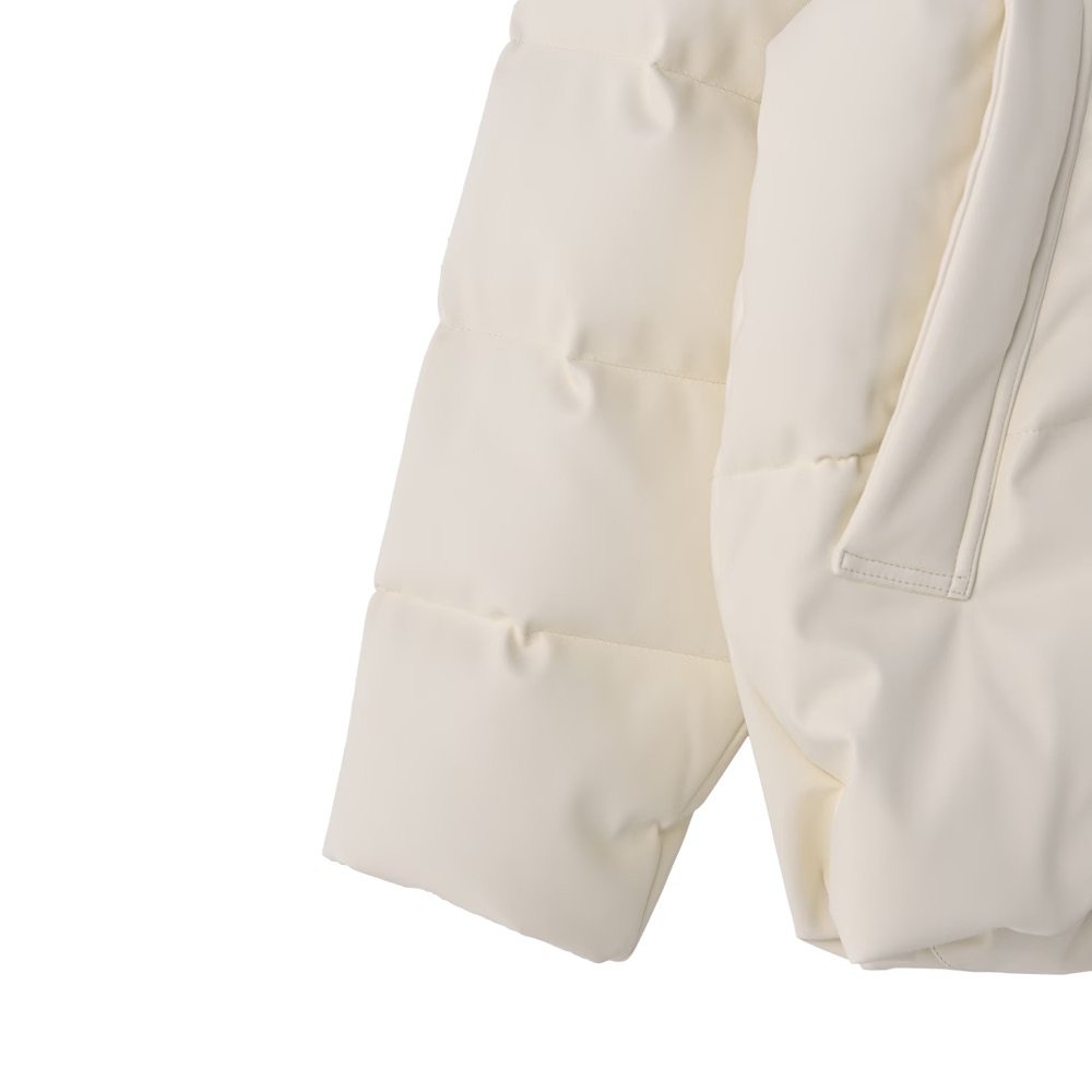 フェイクレザー素材を使用したダウンジャケット。